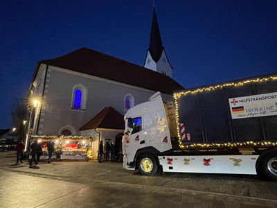 Seit Beginn fahren wir mit einem geschmückten Weihnachtstruck auf den Sankt-Mang-Platz in Kempten. Dort dürfen dann Kinder Weihnachtsgeschenke für die Ukraine abgeben.